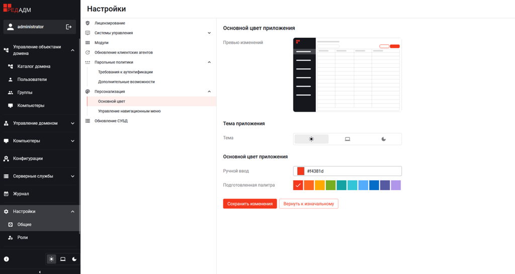 В РЕД АДМ Промышленной редакции 2.1 появилась возможность гибкой персонализации веб-интерфейса. Администратор может настраивать визуальное оформление, выбирать цвета и темы для интерфейса, управлять составом навигационного меню и адаптировать рабочее пространство под потребности организации или отдельных пользователей.