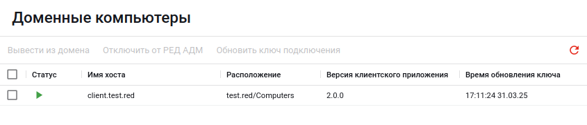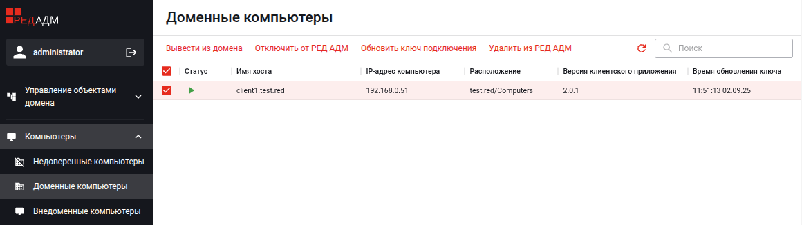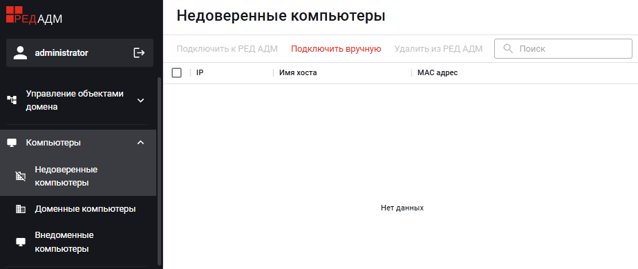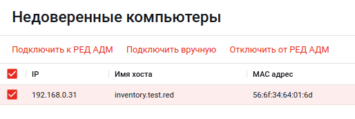 После появления компьютеров в списке в разделе «Недоверенные компьютеры» их через веб-интерфейс РЕД АДМ можно подключить к РЕД АДМ и ввести в домен.