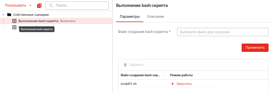 б) Для запуска отдельного сценария перейдите в соответствующую секцию (скрипты или плейбуки), и в правой панели в таблице, в строке для нужного сценария в колонке «Режим работы» нажмите кнопку «Запустить».