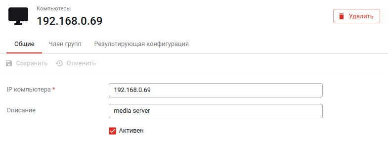 1) Для просмотра и редактирования свойств компьютера нажмите на его IP-адрес в списке. На открывшейся странице будут доступны вкладки «Общие», «Член групп» и «Результирующая конфигурация»: