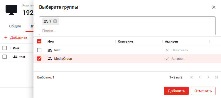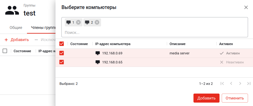 Для добавления новых членов из числа имеющихся внедоменных компьютеров нажмите кнопку «Добавить» и в открывшемся модальном окне выберите компьютеры и в этом же окне нажмите кнопку «Добавить»: