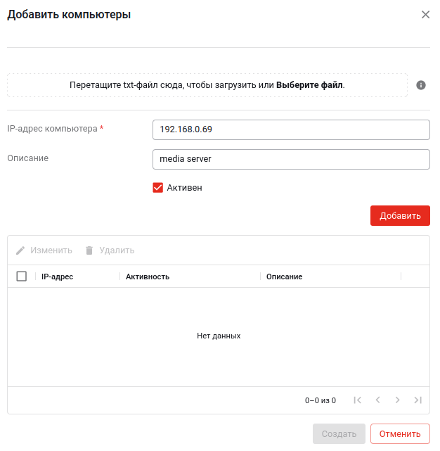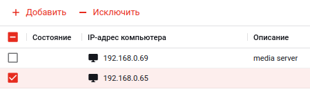 3) При добавлении компьютеров из файла используется файл, где перечислены IP-адреса нужных компьютеров (каждый адрес располагается с новой строки). Сам файл появится в списке файлов (откуда его можно исключить), а компьютеры из файла появятся в списке на добавление: