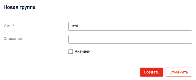-- в открывшемся модальном окне укажите параметры (см. рисунок ниже): имя группы; описание группы (при необходимости); статус группы -- активна она или нет;