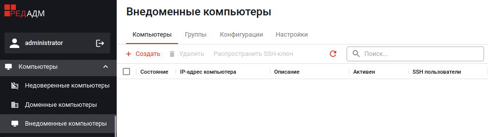 РЕД АДМ позволяет управлять компьютерами, которые не входят в домен. В разделе «Внедоменные компьютеры» можно добавлять и удалять внедоменные компьютеры и их группы, а также распространять на них собственные сценарии: