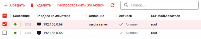 2) Выделив компьютер (или несколько компьютеров) в списке, можно его удалить либо распространить на него SSH-ключ (см. далее) -- станут активными соответствующие кнопки: