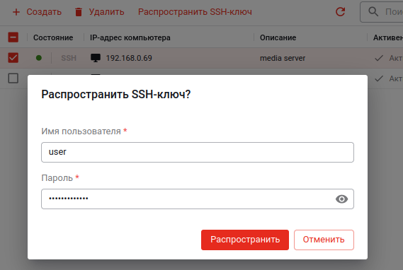 Выделите нужные компьютеры и нажмите кнопку «Распространить SSH-ключ».