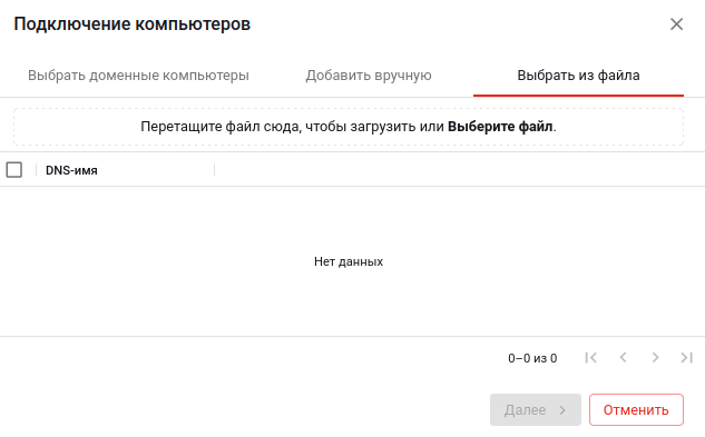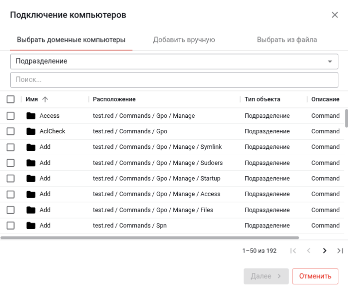 Нажмите кнопку «Подключить вручную» и в открывшемся модальном окне выберите компьютер, подразделение или группу из числа имеющихся в домене: