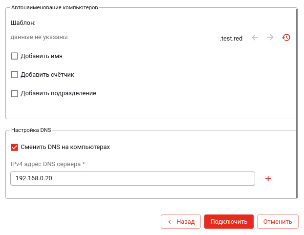 Здесь dc1.test.red и 192.168.0.21 -- соответственно FQDN-имя и IP-адрес для сервера РЕД АДМ.