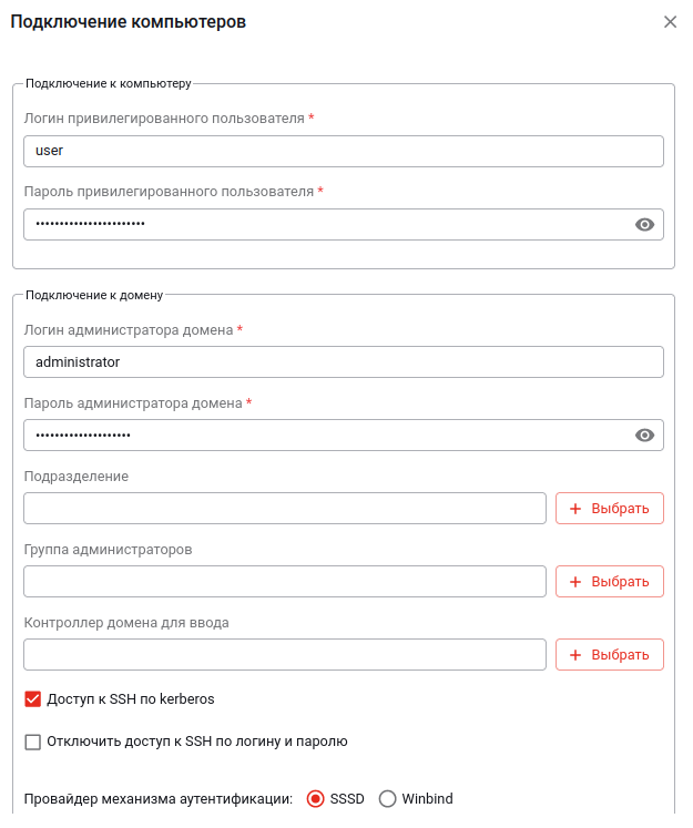 Если одновременно добавляются несколько компьютеров, то учётные данные локального привилегированного пользователя должны быть одинаковы на всех них.