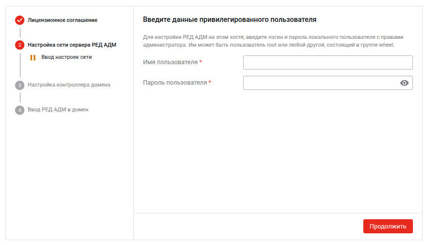 4. На странице «Ввод данных пользователя» Вам необходимо ввести логин и пароль для настроенной ранее локальной учётной записи привилегированного пользователя и нажать на кнопку «Продолжить»: