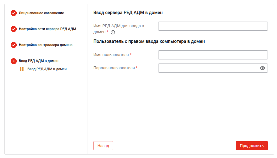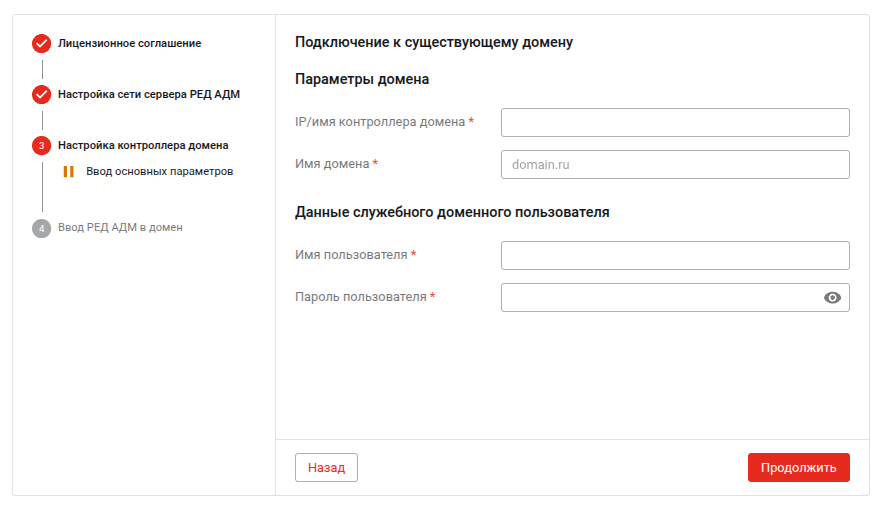 5. Далее нужно подключить РЕД АДМ Сервер к существующему домену. Введите параметры домена и данные служебного доменного пользователя (администратора) и нажмите кнопку «Продолжить»: