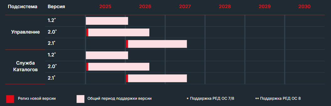 На рисунке ниже приведена диаграмма, на которой отображены сроки релизов и поддержки для подсистемы управления РЕД АДМ и подсистемы Службы каталогов, входящих в РЕД АДМ (промышленная редакция).